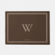 A doormat featuring a minimal style monogram framed in the centre. Underneath this towards the bottom is the established date of your family. The background contains deep brown. The outside border frame is tan to compliment the background along with the tan monogram.