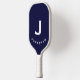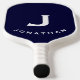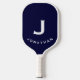 Masculine modern design features navy blue background with easy to use template for a single letter and name in stylish classic professional leterring. The design repeats on the reverse side. Perfect pickleball gift for him.