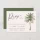 Tropical wedding RSVP card featuring a single palm tree illustration on the right side of the design with an ivory background. "RSVP" is displayed in a black handwritten script with your RSVP date, custom accepts/declines wording, and meal options shown below. The palm tree RSVP card was designed to coordinate with our Minimal Palm Tree wedding collection. A matching RSVP card without meal options is available.