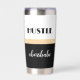 Hustle like a boss babe Insulated Tumbler. A modern, chic design with bold typography on a black and white background divided by a champagne gold-coloured border. Personalise the tumbler with your name and carry it with you wherever your hustle takes you.