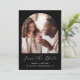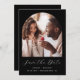 This simple, minimalist Save the Date card features a boho photo arch above the words "Save the Date" in elegant white handwriting script, followed by the couple's names, wedding date and city in sans serif font on a black background. Add a more detailed message with additional information on the reverse, along with a QR code that sends guests to your wedding website.