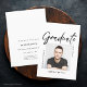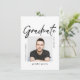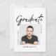 Celebrate your Graduation with this ModernMinimal Photo Script College Graduate Party Invitation designed in black and white, with a central photo and the word "Graduate" in modern script calligraphy. This clean invitation is perfect for a male graduate like your son graduating from college or university.