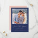 This simple, minimalist Save the Date card features a square photo above the words "Save the Date" in elegant blush pink handwriting script, followed by the couple's names, wedding date and city in sans serif font on a navy blue background. Add a more detailed message with additional information on the reverse in navy blue on a blush pink background, along with a QR code to help guests access your wedding website.