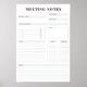 A minimal black and white meeting notes planner for your home office or professional workplace. Features space for a project name, dates, topics to discuss, a to do list with responsible people and deadlines and space for your more notes.