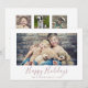This minimal rose gold Happy Holidays year in review landscape holiday card is the perfect simple holiday greeting. The design features classic blush pink and white typography paired with a rustic yet elegant script font with hand lettered style. Personalize the card with 4 photos, your family name, first names, and year. Include a year in review or family newsletter on the back of the card.