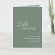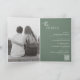 Modern olive green / sage green folded wedding invitation featuring a simple and minimal design with the bride's name in an elegant script and the groom's name in a contemporary sans serif font. Below in the lower right corner are your event details in a minimalist layout. The inside has your favourite photo and your additional details, including an optional QR code (if you prefer, the QR code may be removed in the design editing tool). The back has two more optional sections for more information.