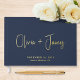 This minimal and elegant dark navy blue wedding guest book features your choice of real gold, silver or rose gold foil, your names in a chic modern script, your wedding date and location in classic serif typography and your personalised title on the spine.