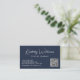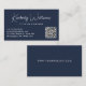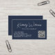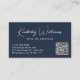 Professional elegant and minimal dark blue business card featuring your name in a modern stylish white script and your company, title and contact information in simple and clean white typography. Input your website's URL address to create a scannable QR code. On the back, customise additional text or leave blank.
