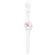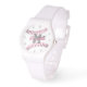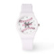This sporty softball themed watch features a pair of simple, minimalist style softball graphics (showing only the softball's stitches in pink and black) that are slightly offset from each other on a customisable white background with grey clock face numerals - customise with player name and monogram - by katz_d_zynes