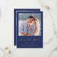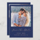 This simple, minimalist Save the Date card features a square photo above the words "Save the Date" in elegant blush pink handwriting script, followed by the couple's names, wedding date and city in sans serif font on a navy blue background. Add a second, horizontal photo and a more detailed message with additional information on the reverse.