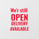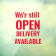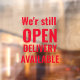 Let your customers know you’re still here for them with this bold red "We're Still OPEN – Delivery Available" window cling. Perfect for restaurants, takeout counters, grocery stores, and other small businesses offering delivery services. This large adhesive sign is designed for clear visibility, even from a distance. Easy to apply to windows or glass doors and fully customisable for your needs.