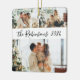 Modern Simple Elegant Calligraphy Black White 3 Family Photo Collage Merry Christmas Script Ceramic Ornament. This festive, minimalist, whimsical three photo holiday Ornament features a pretty grid photo collage and Family name and year! The family name is written in a hand lettered swirly font script in black on white colour background. On the reverse side one photo with family name. Pretty keepsake for your family and friends in Christmas Holiday season.