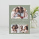 This simple, minimalist Save the Date card features a 3-photo collage, with an arch-shaped photo at the top and two smaller square photos at the bottom. In between, the words "Save the Date" appear in elegant white handwriting script, followed by the couple's names, wedding date and city in sans serif font on a sage green background. Add a more detailed message with additional information on the reverse.