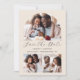 This simple, minimalist Save the Date card features a 3-photo collage, with an arch-shaped photo at the top and two smaller square photos at the bottom. In between, the words "Save the Date" appear in elegant black handwriting script, followed by the couple's names, wedding date and city in sans serif font on a beige background. Add a more detailed message with additional information on the reverse, along with a QR code to help your guests visit your wedding website.