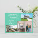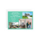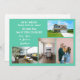 Minimalist, elegant, trendy moving announcement card with 4 custom photos, the names of family members, and the text "We've Moved! Come visit us soon!" + the new address and landline phone number on the front for you to personalise. Modern, chic aquamarine teal background with white writing.