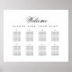 A simple, minimalist seating chart with 8 tables, recommended for a wedding, but can be used for any other celebration. The background is white. All text is black. The word Welcome in the upper part is written in an elegant calligraphic script, the rest in caps.