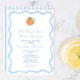 This Bridal Shower invite has a minimalist aesthetic, with a limited colour palette, simple wavy border, a single orange with leaves and a blue and white striped reverse.