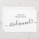 A minimalist bridesmaid proposal card featuring simple and elegant script on black and white would typically have a sleek and stylish look. The use of a black and white colour palette creates a bold contrast and provides a modern and sophisticated feel. The script font would be clean and refined, adding a touch of elegance to the design. The minimalist layout would keep the focus on the wording, making it clear and easy to read. The use of negative space would create a sense of balance and simplicity, giving the card a minimalist and timeless look.