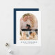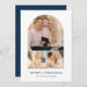 Modern holiday photo card featuring 3 of your photos arranged in an arch-shaped grid layout. Personalise the front of the multi-photo holiday card with your custom greeting and family name displayed in navy lettering. The card reverses to a subtle navy and white dot pattern.