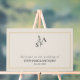 Add a touch of elegance to your wedding decor with this monogrammed beige and grey wildflower acrylic sign, designed to complement minimalist and nature-inspired styles. With its refined finish, this banner pairs beautifully with off-white and sage colours. Ideal for adding a unique detail to your wedding suite, this banner bring timeless sophistication to any occasion. The design features a beige background and dark grey text. At the top, this banner feature a beautiful wildflower between the bride and groom's initials. The text is inside a gold frame.