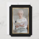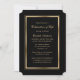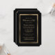 Elegant black and gold celebration of life invitation featuring event details inside a gold frame on the front and a photo at the back.