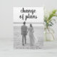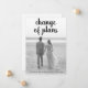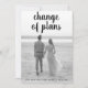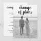 Photo Wedding Postponement Announcement Card featuring your full bleed vertical picture and a text overlay with the words, "change of plans" in a thick black script handwriting at the top and one line of text at the bottom for details. The backside has your updated information in black over a white background. A simple and modern design that makes your photo the main feature.