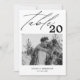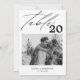 A different way to show your wedding table numbers. Designed to match the "Vivian" Collection. This template includes 1 picture that could be when you were kids or as a couple, table number in. modern calligraphy typography, couple's names and wedding date.