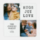 Embrace the holiday season with our minimalist black and white Christmas holiday ornament. Exquisitely designed to feature four of your favourite family photos, beautifully inscribed with the heartfelt message 'hugs, joy, love'. Personalise them with your name and the year, creating a precious keepsake for your loved ones.