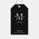 Minimalist black & white clothing hang tag design with modern fonts, simple layout and space for your logo or monogram. This elegant fashion boutique swing tag allows you to edit all colours and add your contact details, and it includes size, price and SKU table and simple washing instructions icons for clothes (edit using the design tool for more washing care icons in the hidden layers). The perfect finishing touch to your couture business packaging design.