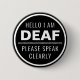 Display your special needs in style with this simple hard-of-hearing badge by JessicaAmber. This button features the slogan 'Hello I am deaf, please speak clearly' in an easy-to-read bold font. You can edit the text as needed. Has a minimalist black and white design. A great gift for dads with hearing aids. ⭐ For more disability pins, visit my store: Zazzle.com/Elder_Vitality ⭐ For custom orders, message me on Zazzle
