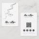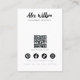 This jewellery display card features a minimalist, simplified drawing of female long, wavy hair and full lips designed in black and white for a simple, clean, elegant look. It includes spots to showcase earrings on her ears. The card is customisable with your name, website, slogan, and social media icons, plus a QR code for easy digital access.