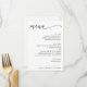 This minimalist wedding menu features a clean white background with modern black script for the heading and crisp sans serif fonts for the meal details. Displaying each course in a clear, elegant layout, this card adds a stylish touch to any reception table. Fully customisable with your names, wedding date, and dinner selections. It’s perfect for contemporary, formal, or black-tie weddings.