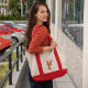 Love the durable cream colored canvas and navy blue contrasted handles. Perfect for carrying my laptop and papers.