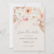A minimalist boho wedding save the date cards featuring watercolor white peonies, soft peach roses and pampas grass floral bouquet on an ivory cream colour background.