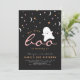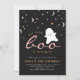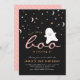 Minimalist Halloween themed birthday invitation in black, pink and sprinkles of orange and silver. Featuring cute ghosts and "boo" text in fun typography style. Personalised with name, age and party details.