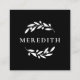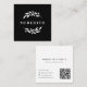Minimalist Botanical QR Code Black and White Square Business Card Template... Modern minimalist business card with a botanical wreath of olive branches bordering your name on a chic black background. The white back of the card displays your personalised QR code and contact information in black sans serif typography. The example QR code and all text on front and back can be easily revised with your own details on the personalisation template.