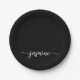 Modern Minimalist Elegant Black Feminine Monogram Name Script Signature Custom Personalised Paper Plates. This design featuring your first name in a pretty hand lettered style swash tail font signature typography (or calligraphy) white script on black colour background. These are easy to customise it. Great for housewarming, also for birthday, wedding, sweet 16 birthday party, bachelorette party, for graduation party, bridal shower, baby shower and It’s for the girl who loves unique minimalist things.