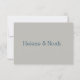 A minimalist and clean design with simple type in blue on a juniper green background on the front and grey background on the back to give a fresh and modern feel. This design is also available in other colours in my store. You can also personalise this RSVP with your names on the back.