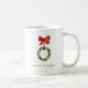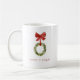 A simple merry + bright christmas holiday mug. This christmas coffee mug features a hanging boxwood christmas wreath with a red bow. All text can be customised with any wording of your choice.
