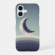 A stylized crescent moon resting above a planetary horizon, featuring a minimalist retro style.