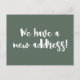 This modern minimalist we moved announcement postcard features fun brush lettering in dark sage green and white.