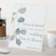 Minimalist Dusty Blue Wedding Pedestal Sign. An elegant modern design with Dusty Blue Foliage. Easily personalise with your details. Change the text and background colours if you wish to match your own wedding colour theme via the Edit further option.