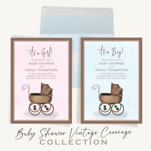 This design features a baby shower invitation blue boy, elegant vintage rustic carriage, basket bunting cute Victorian buggy, it's a blue theme, with a minimal minimalist watercolor modern style, mother mummy to be, a cute whimsy stylish fun design, trendy brown whicker simple, modern calligraphy script typography, pregnancy new baby