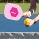 This modern pickleball paddle design features a pink background with your initial in bold light pink letter inside a geometric shape, for a look that is simple and stylish, yet professional.