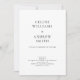 The wedding invitation features a minimalist and elegant design with a clean, white background. The text is arranged in a centred layout with a classic serif font for the main names and a sans-serif font for the smaller details. The names of the couple are prominently displayed in uppercase letters, creating a striking focal point. Below, additional text is aligned neatly, providing event details in a simple and modern style. Subtle spacing and alignment lend the design an airy and sophisticated feel, complemented by the use of black typography for a timeless monochrome palette.