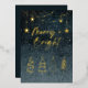 It features brushed script calligraphy text 'Merry + Bright' and pine tree doodles on the royal blue starry sky.
