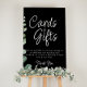 This minimalist eucalyptus black cards and gifts sign is perfect for a rustic wedding or bridal shower. The design features a beautiful calligraphy font and a green watercolor eucalyptus in a dark background.