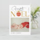 This adorable Christmas card features a heartwarming photo of a sweet baby in a Santa hat, announcing their first Christmas in a playful and stylish way. The front of the card features the words "First Noel" with a festive ornament, and "2024" in a bold, elegant font, making it a perfect way to commemorate this special occasion. The overall design is both timeless and festive, perfect for sharing the joy of a newborn baby's first Christmas with loved ones.