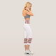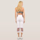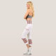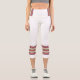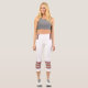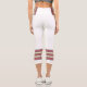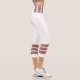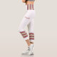 Three-tone design with retro style stripes on the lower legs. Horizontal five lines in fuzzy wuzzy pink, cookie and cream beige with Davy's grey (purple) borders. For your sporty white Capri leggings. Add a personal touch to your outfit with your name on the left side of these high-waisted athleisure leggings.