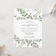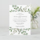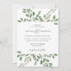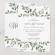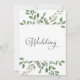 This trendy wedding invitation features a frame of abundant watercolor green leaves and a few tiny berries on a clean white background. The back of the invitation also says "Wedding" in elegant calligraphy.